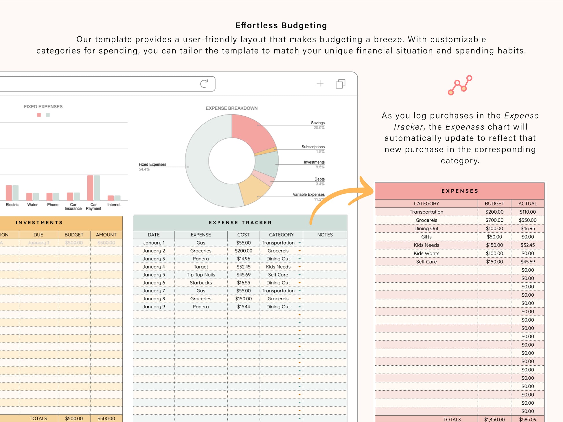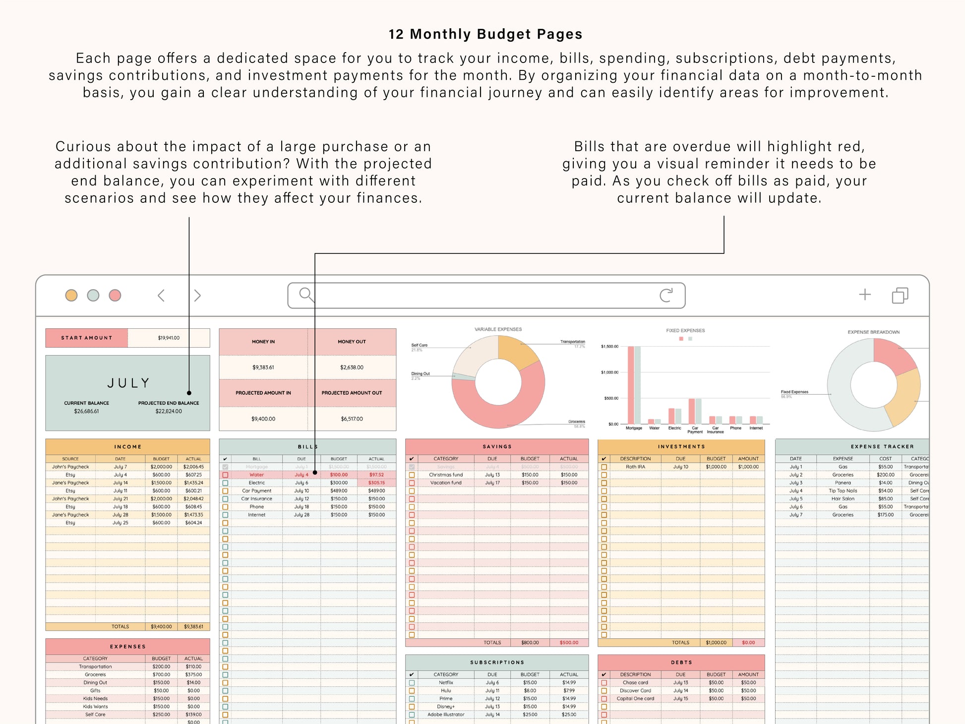 Here you can log income, and track expenses, bills, debt payments, investments, savings, and subscriptions. All of the formulas automatically calculate, making budgeting a breeze!