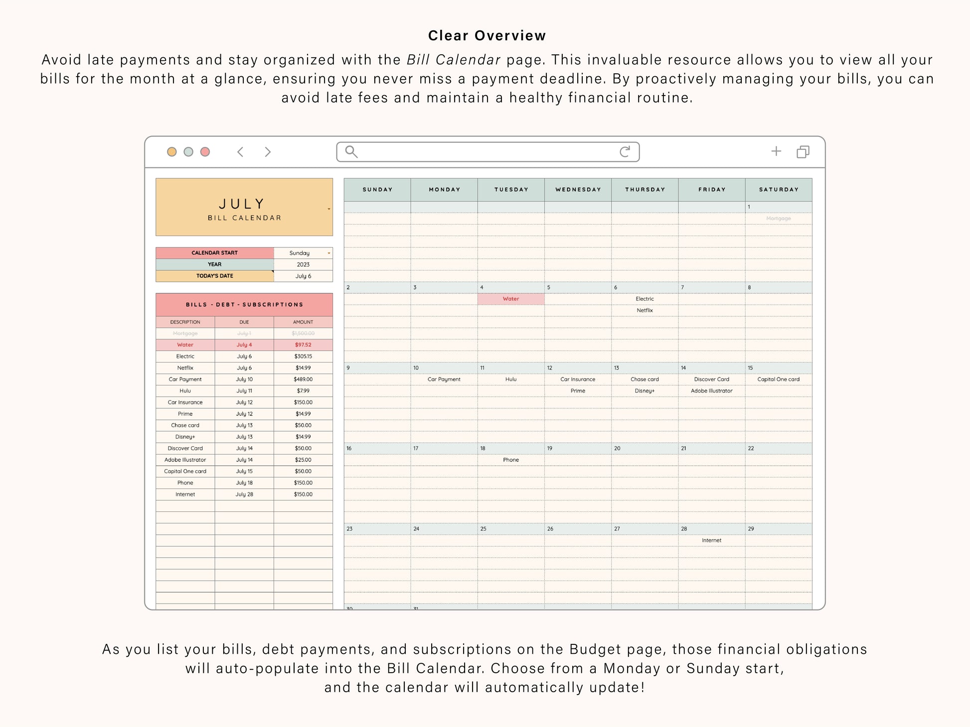 Avoid late payments and stay organized with the dedicated bill calendar page. This invaluable resource allows you to view all your bills for the month at a glance, ensuring you never miss a payment deadline.