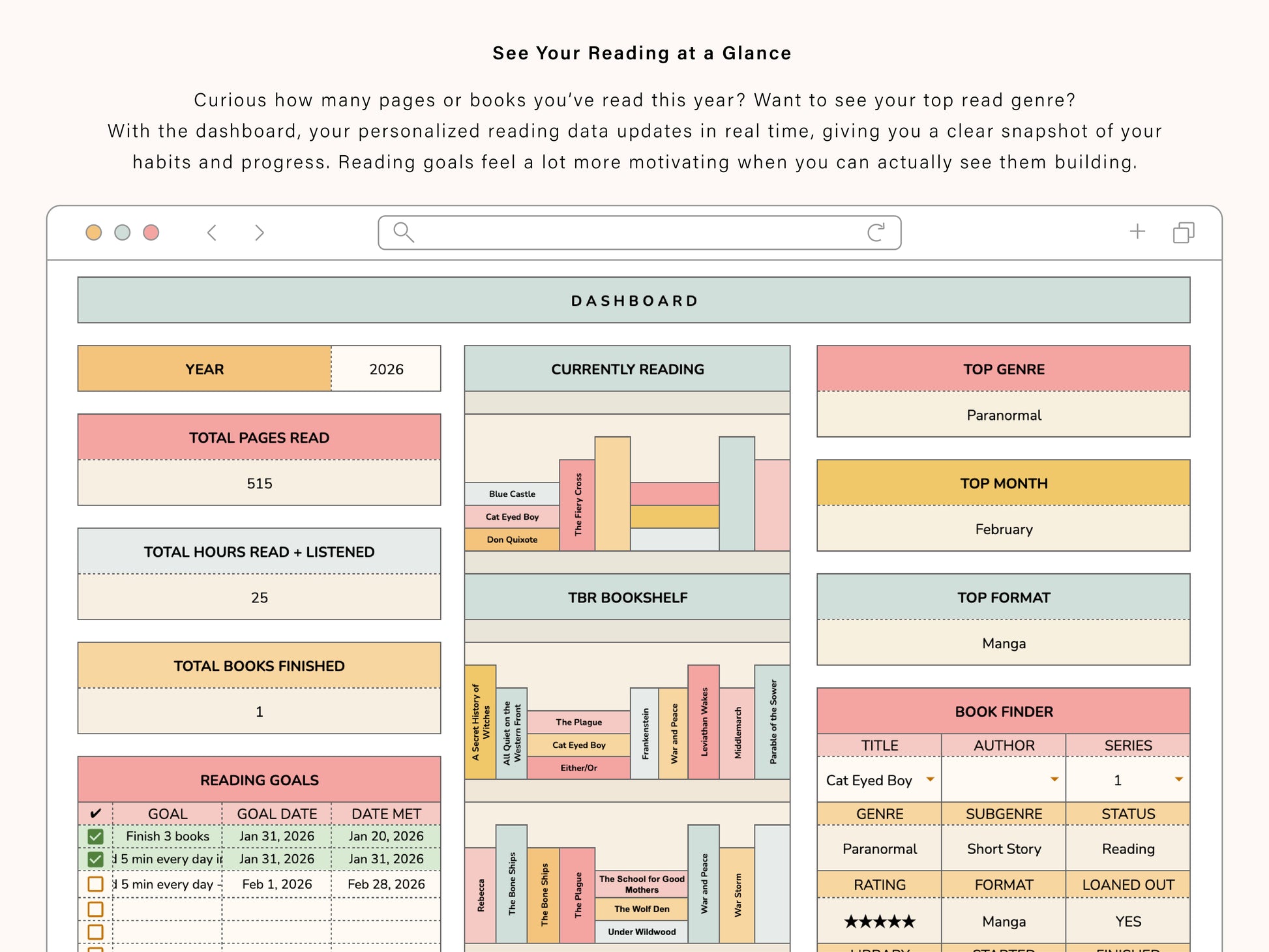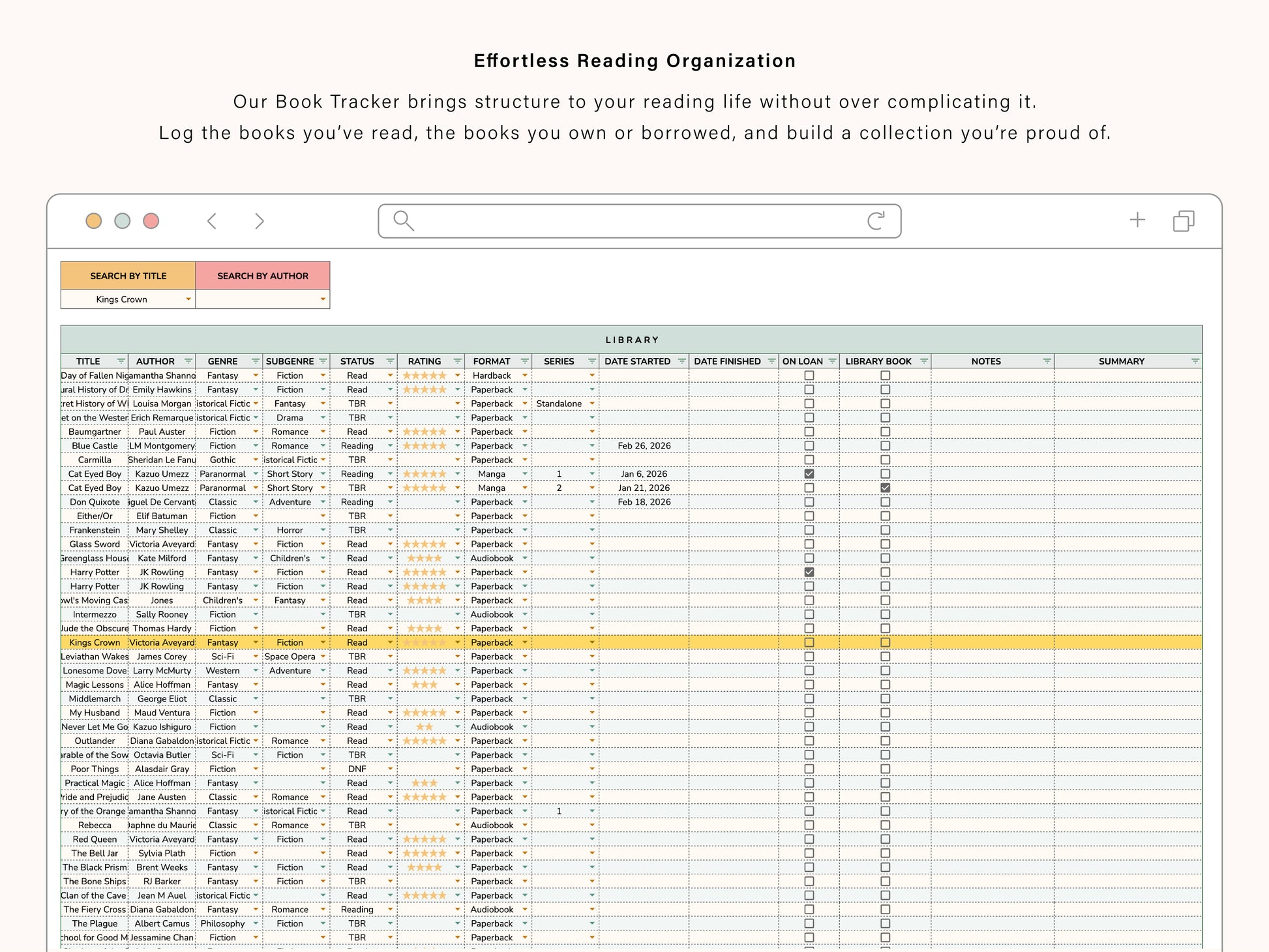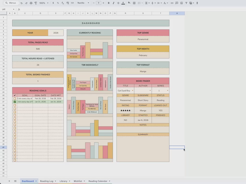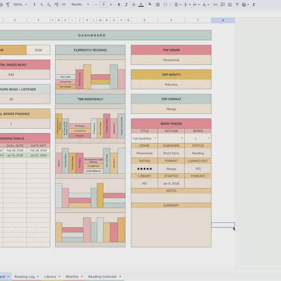 A sheet for all of the books you own or borrow. Whether physical, eBook, or audio, you can keep track of it here. Log the genre, your rating, the status, whether or not it's part of a series, and if you have loaned out the book. Room for all of your notes as well!