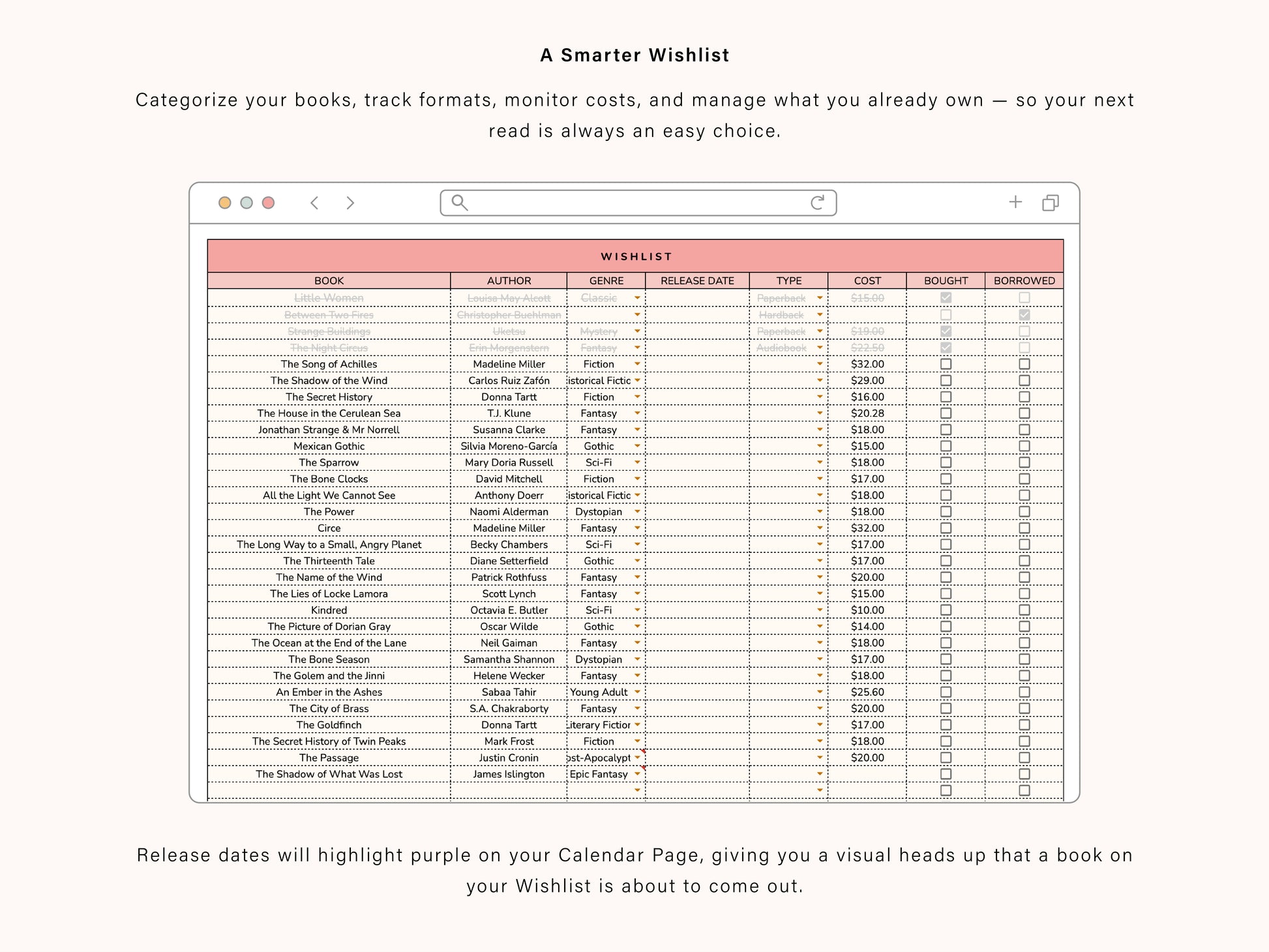 Now you can keep easily keep track of the books you have been wanting to purchase or read. Keep track of the cost, and check the book off when you have either read or bought it.