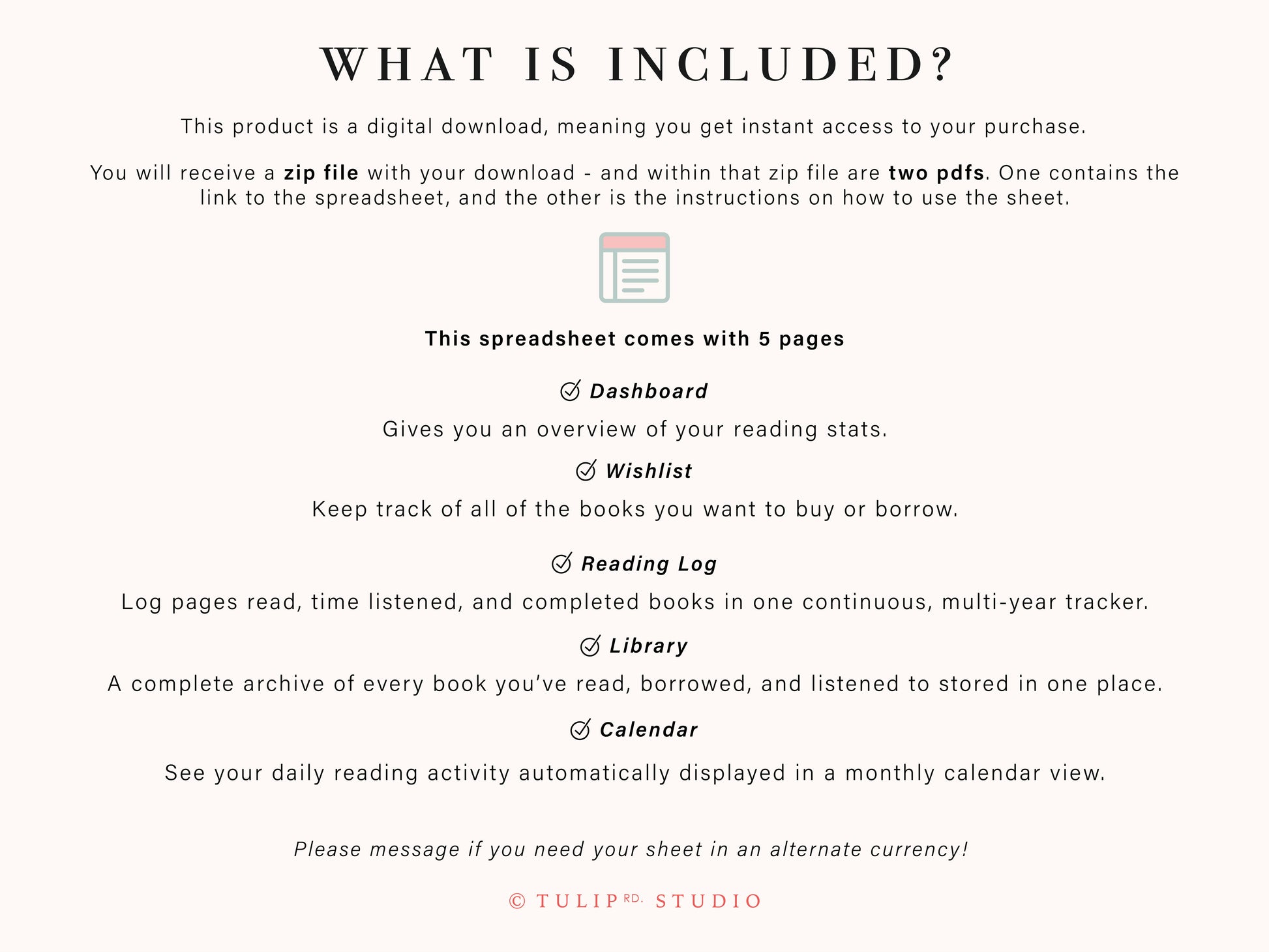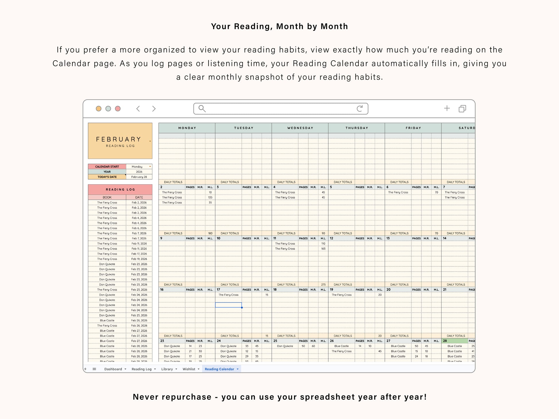 A clean, organized spreadsheet for you to keep track of all of the books you own, what you have read, what you have loaned, your wishlist, and more. Good to use year after year, so you never need to buy a new tracker. Perfect for any bibliophile!