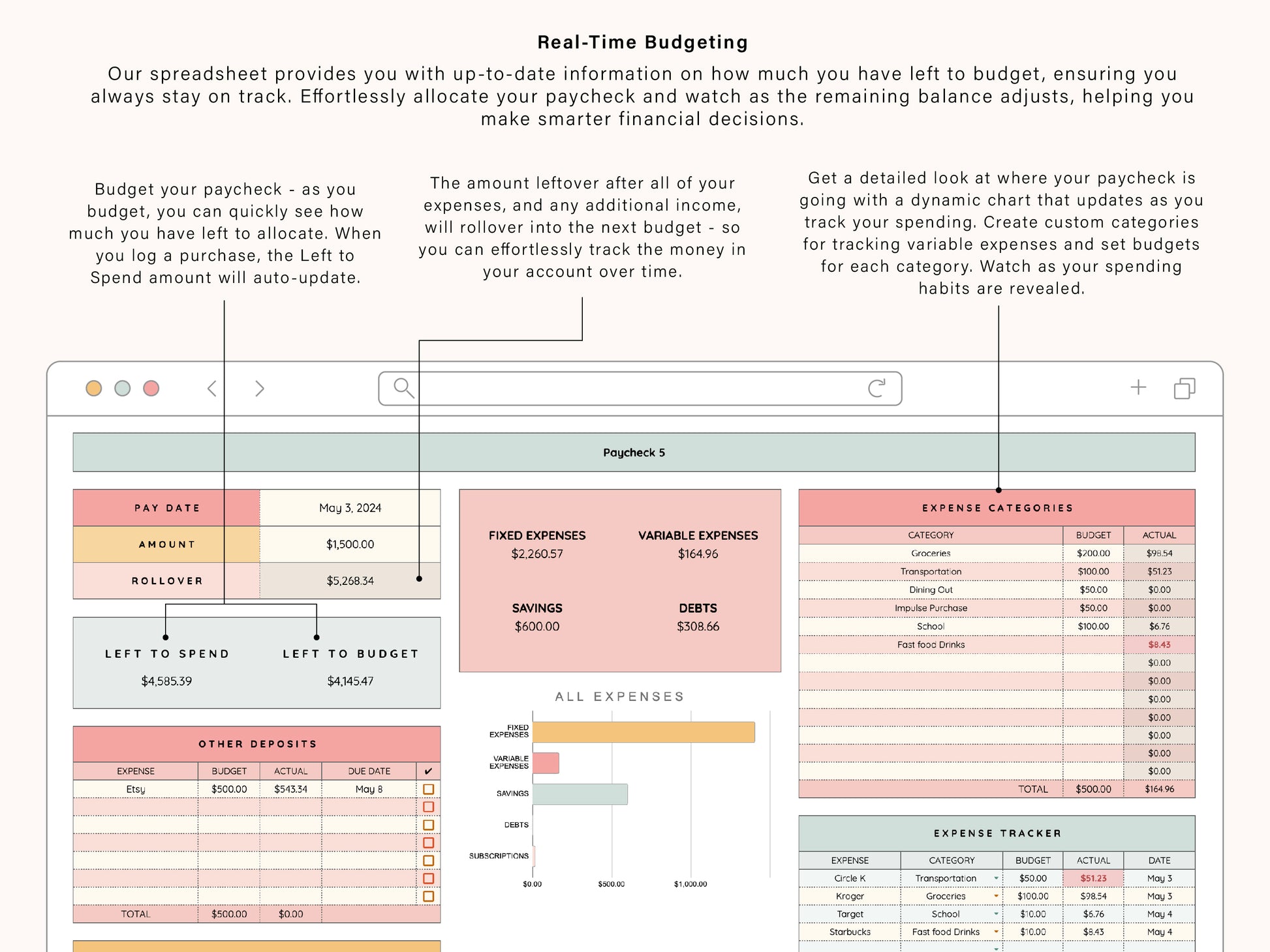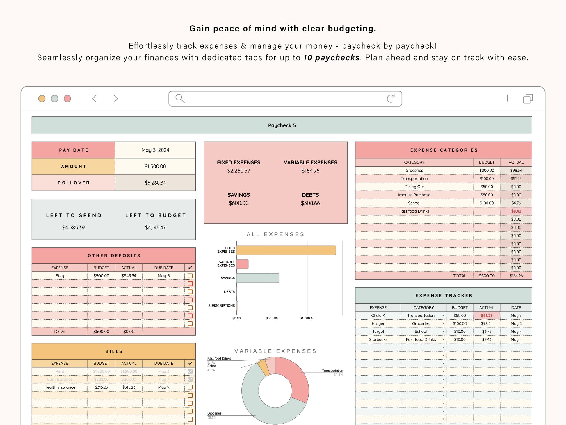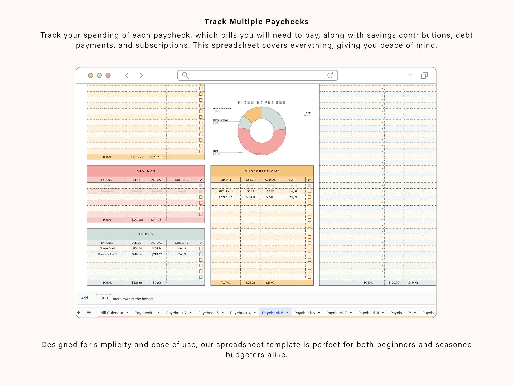 Plan and allocate your money efficiently with dedicated budgets for each paycheck. From bills and debts to subscriptions, savings, and variable expenses like groceries and dining out, our template has you covered. Stay organized and in control of every aspect of your spending.